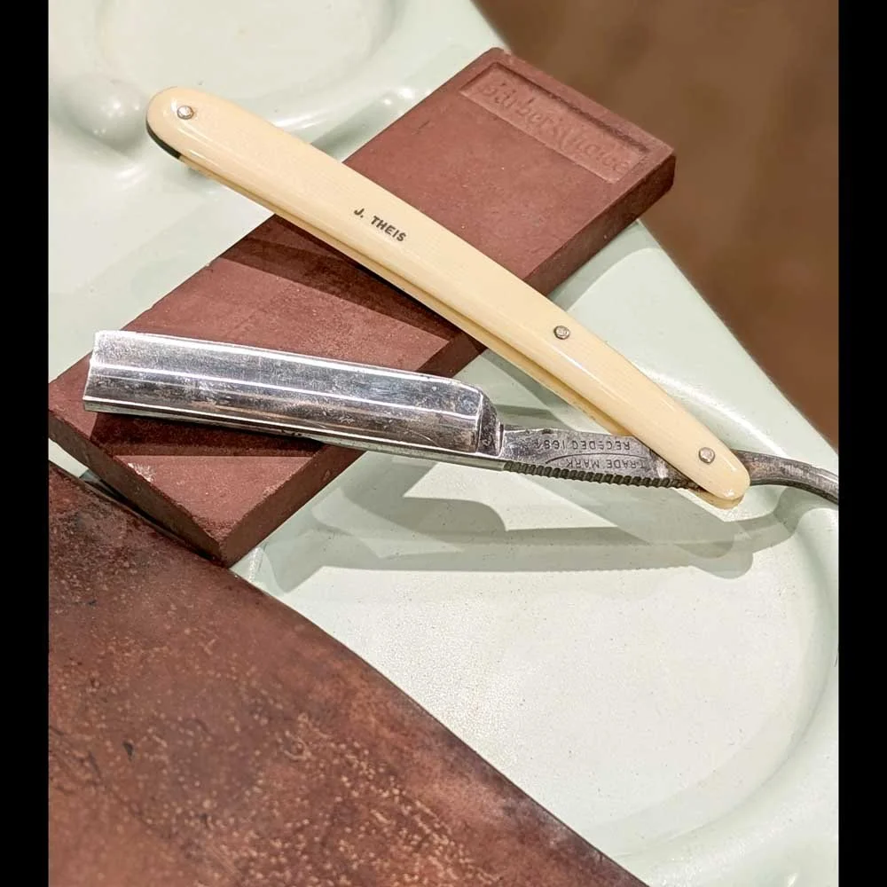 Well, actually that does not tell you all that much. So to elaborate, this is an elegant straight razor, manufactured in Sheffield England, by the George Wostenholm & Son company. It has its original box, and the name “J. Theis” engraved in its handle. The blade has one small chip and only minimal rust spots. It’s a lovely collector’s piece or a fun project to restore! Inquire for additional photos.